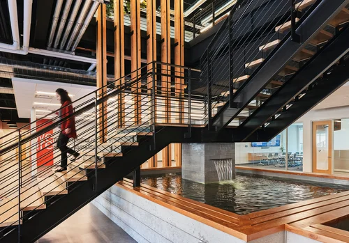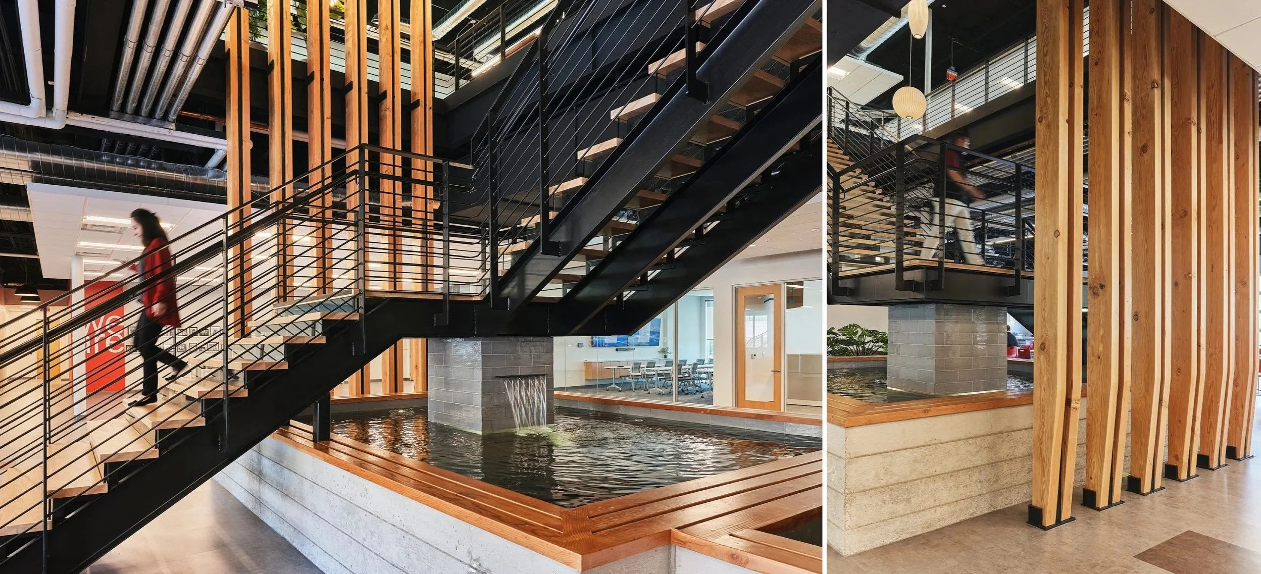 “As an office headquarters, this design truly considered the team members by maximizing daylight, views, and open space. Biophilia is emphasized with the koi pond for playful interaction with nature. Well done design!”
