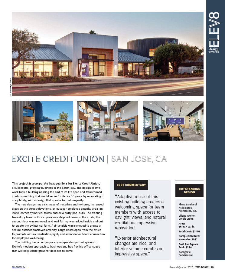A recent BAA design for the Excite Credit Union corporate headquarters project, has been selected as a winner in the ELEV8 Design Awards, and has been published in the most recent issue of BUILDINGS magazine, a national publication.